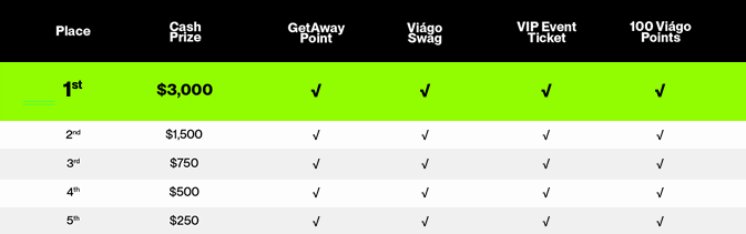 All Top 10 Earners will also receive 100 Viágo Points and a VIP Ticket to the next event!